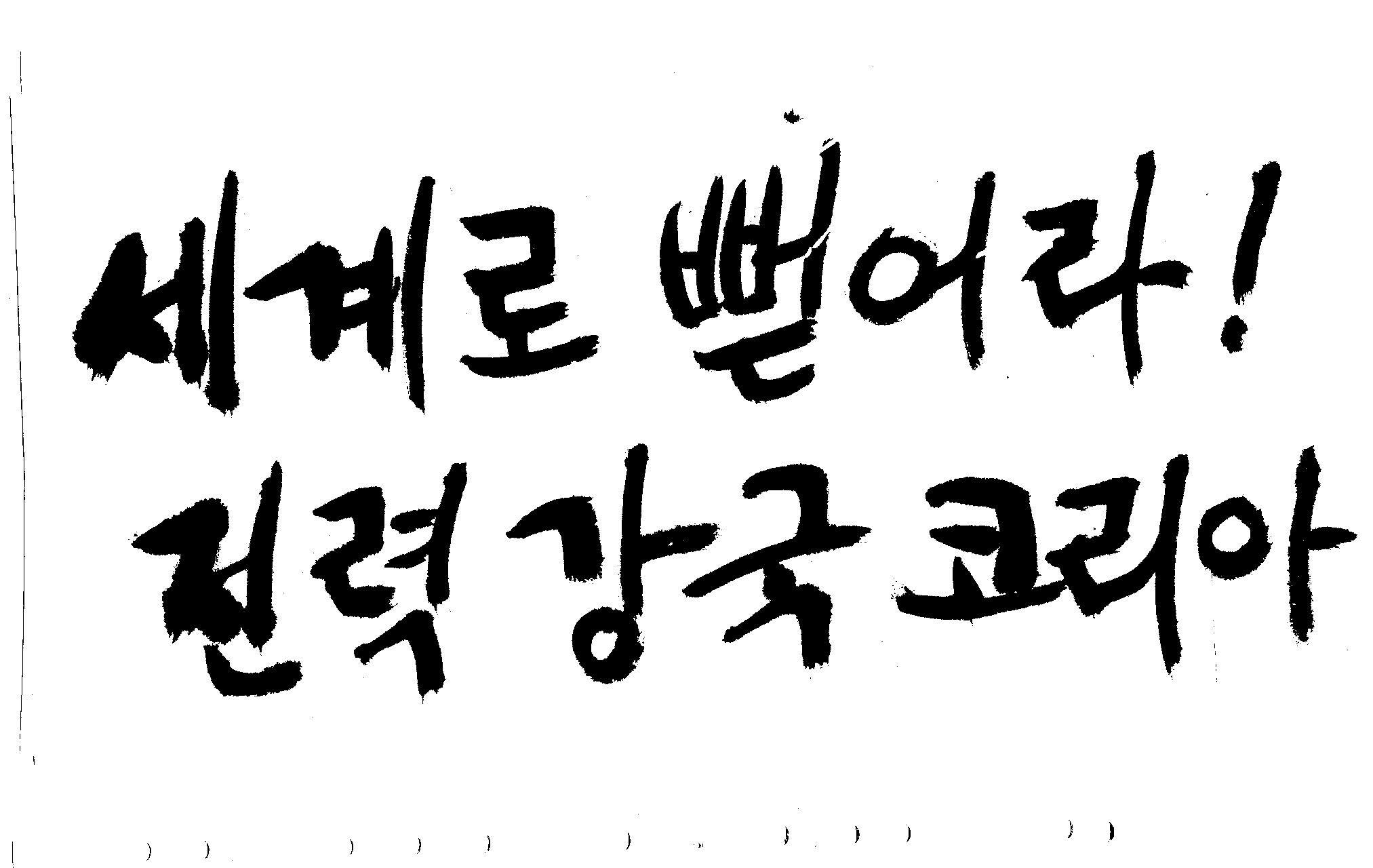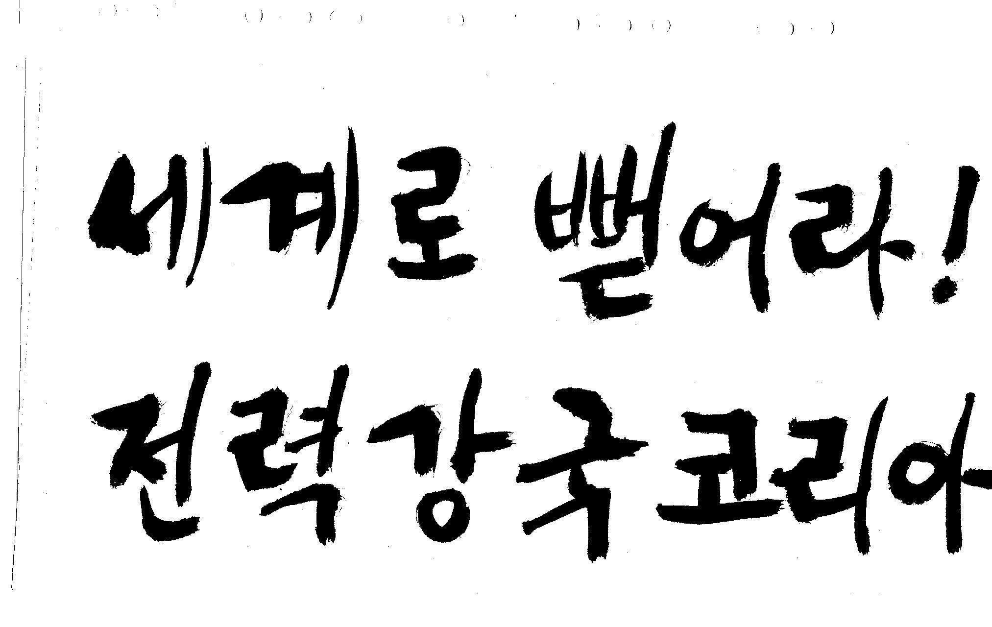 캘리 좀 부탁드려요!~ 김철호 일반 1 10591 2008.12.24 12:09 > > > > > 전력회사 신문광고를 하는데요 캘리로 멋지게 하고픈데 > > 캘리프로그램으로 아무리 써도 느낌이 안나옵니다 ㅜ.ㅜ > > 이런걸 부탁한다는 자체가 너무나도 염치없지만 부탁드립니다. > > > > 세계로 뻗어라! 전력강국 코리아 > > > 보기는 쉬워도 하기는 어려운게 > 세상 모든 일 일겁니다. > 그중에 캘리그라피가 그런것 일 겁니다... > 스캔중에 글꼴이 잘린것은 서로다른글꼴서 편집하시길... > 글수가 많아서 어쩔 수없네요... >